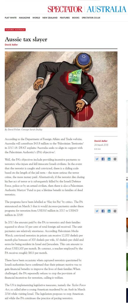 This article was part of a coordinated AJA advocacy effort that exposed how Australian tax dollars were contributing to terrorism and led to Australia changing its foreign policy.